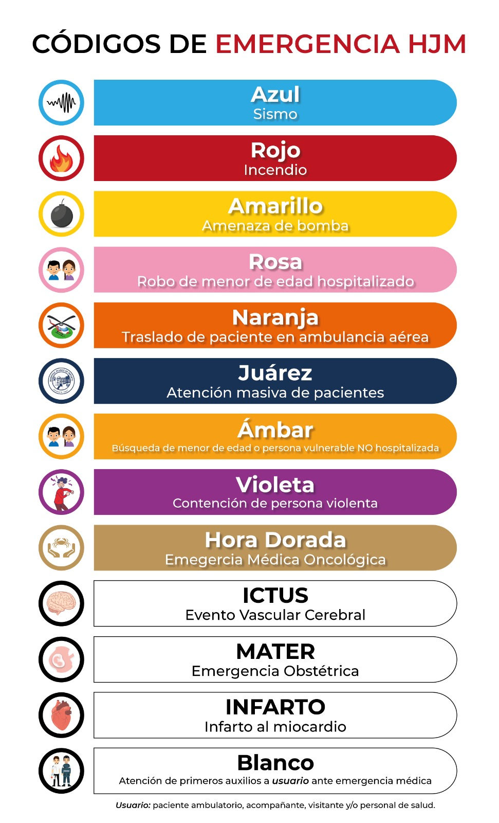 De igual manera, se ha implementado un sistema basado en seis Códigos de Emergencia Institucionales con la finalidad de comunicar a los usuarios y personal del HJM en el momento que se genere una emergencia, iniciando con las acciones correspondientes de acuerdo al tipo de amenaza.